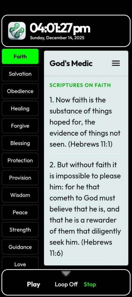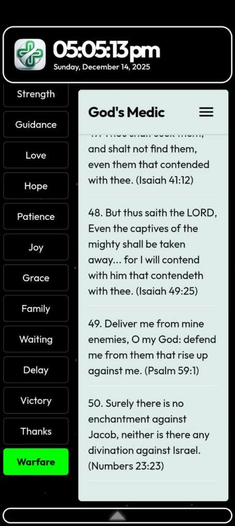 God’s Medic is your pocket pharmacy for the soul, prescribing the perfect scriptural remedy for every condition of the heart. With over 1,150 powerful Bible verses categorized into essential topics like Healing, Warfare, Obedience, Faith and so on, you can instantly find the truth you need. Featuring draggable zoom controls for easy reading and integrated audio tools, God’s Medic ensures you are always equipped with the Word of God.